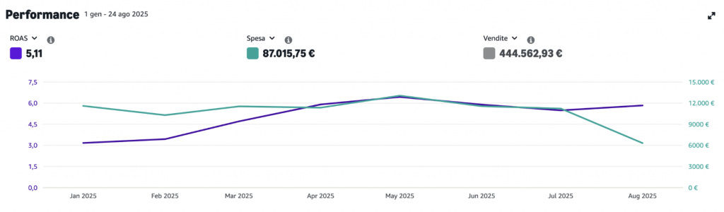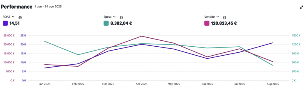 ROAS medio annuo 14,81 (14,81 euro di fatturato per ogni euro speso in pubblicità) in costante miglioramento